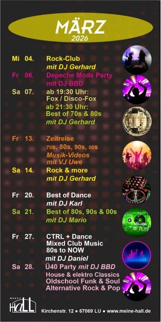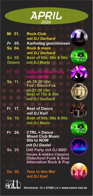 Unten findet ihr unser April-Programm, Karfreitag ist geschlossen, aber ansonsten gibt es wieder prima Tanztage mit den verschiedenen DJs. Bitte beachten, FOX ist im April erst am 2. Samstag.Liebe Grüße, wir freuen uns auf euch.